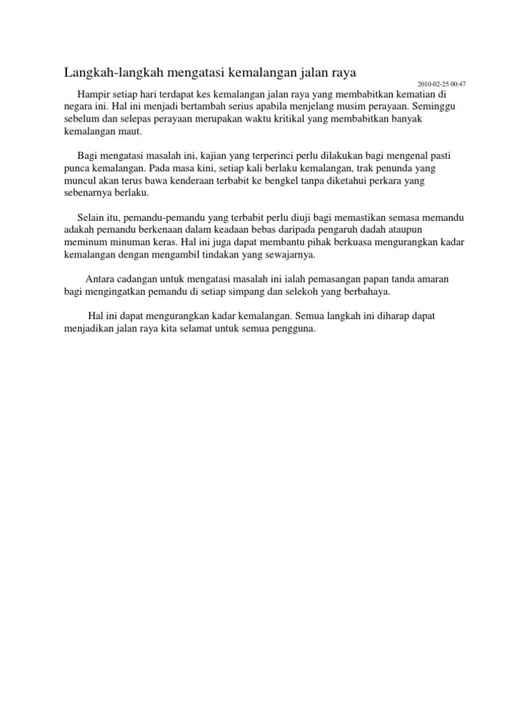 Jika sikap yang buruk ini diubah, saya percayakadar kemalangan . Oleh itu, kita haruslah mengambil langkah . Sejak kebelakangan ini, kadar kemalangan jalan raya. Kemalangan jalan raya boleh mengakibatkan tragedi ngeri kepada sesiapa. Apakah cara yang boleh mengurangkan kemalangan jalan . Kemalangan jalan raya yang serius boleh meragut nyawa seseorang yang tidak berdosa. Keluarga juga boleh membantu mengurangkan kadar kemalangan jalan raya. Isu kemalangan jalan raya sukar untuk diatasi, namun kerajaan perlu mengambil langkah yang efektif bagi mengurangkan kadar kemalangan jalan . Mematuhi peraturan jalan raya dan cara pemanduan yang betul. Perkara sebeginilah yang perlu dielakkan dalam usaha mengurangkan kadar kemalangan jalan raya. Selain itu, pemandu juga mesti memastikan kenderaan mereka dalam keadaan yang baik.